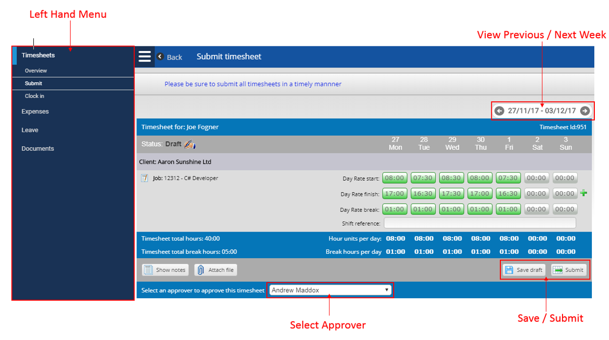 Your timesheet for the current week will be shown in the main area. You do not need to create a new timesheet for each week. All you need to do is move to the week you are interested in. To move between different weeks, use the grey date navigation arrows.