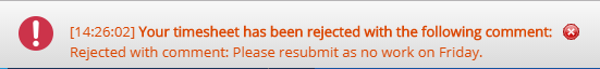 If your timesheet is rejected by your approver, you will receive an email from Timesheet Portal (and a text message as well, if this has been enabled by your agency). Your timesheet will also have the Rejected status icon and a message on top of the page to state why it was rejected.