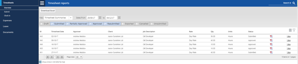 To view the full details of a timesheet, click View on the right hand side to open it, or click on the PDF icon to download it as a PDF. You can also download the list of timesheets as an Excel file by clicking on Download Excel at the top of the page.